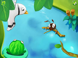 One day a thirsty ant stopped to have a drink from the river. Just then he lost his balance and fell into the water and was washed away. A dove happened to be sitting in a tree nearby and saw what happened. He quickly plucked a leaf off the tree and threw it down into the water next to the ant. The ant was able to climb onto the leaf and was saved from drowning.